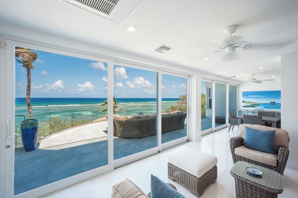 -- The open-concept great room features an oceanfront sunroom with walk-out access to an oceanfront deck overlooking the pool. The deck comes furnished with a large sectional sofa under the shade.