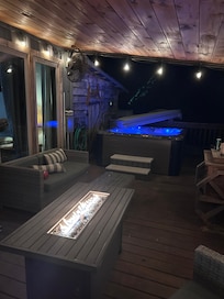 The back deck features fantastic views of the forest and mountains, an 8-person hot tub, an ice chest, built-in fans, and seating for the entire family.