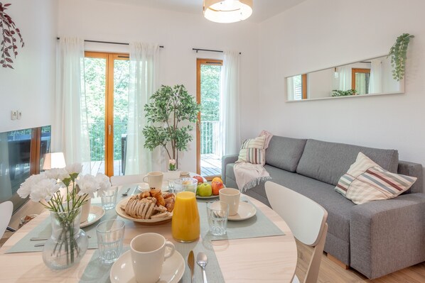 - Une pièce de vie de 15 m² avec TV, canapé-lit double, coin repas ...