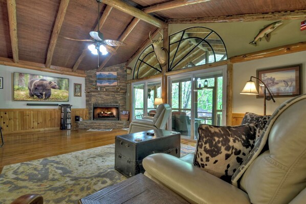 The cozy main living area invites you to relax after a day of hiking trails, visiting orchards, or strolling through downtown Blue Ridge. A gas fireplace adds warmth and ambiance, while a big screen TV and movie library are perfect for evening entertainment. Large windows bring in plenty of natural light and treetop views.