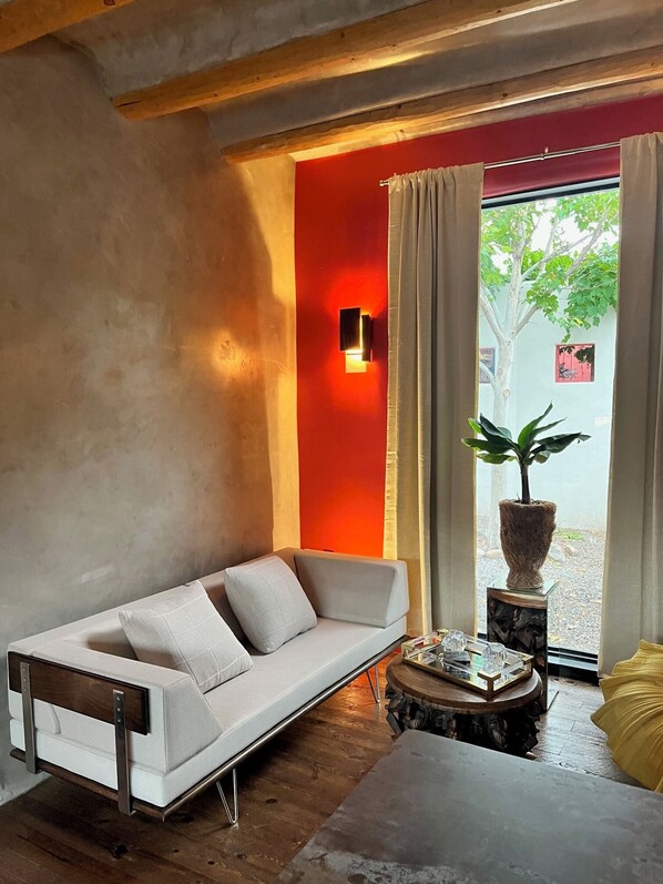 The modern chic organic decor of this casita, inspired by Northern African and Santa Fe architecture creates a sense of relaxation and an intimate connection to the environment.