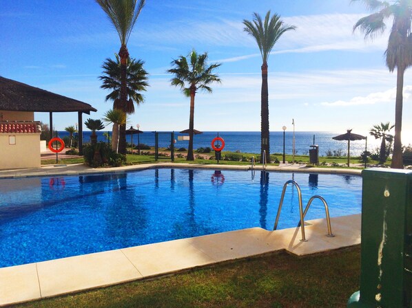This apartment is a corner apartment, so this completely free 180-degree view over the entire coast offers with sunsets from sunrise to late at night!