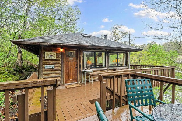 Please Note: There is no access for fishing or swimming. \n\n Additional information to align expectations: Lake Lucerne is a historic resort from the early 20th Century, which originally included a golf course and an airstrip (now long gone). In the early days, the resort was a social center serving the vacationing elite. Over the years, much of the resort was divided up and sold. Today, Lake Lucerne is a historic snap-shot in time. There is no access for fishing, swimming, or boating at Lake Lucerne. The \"lake\" is a spring fed stream with a hand laid limestone dam. Some travelers have had expectations of a large reservoir and have commented that, in their opinion, it is more of a \"pond\". (We assume that the founders didn't like the sound of \"Pond Lucerne\", therefore, it has always been referred to as a Lake.) Over the years moss, and other aquatic plants, have grown in the shallow end of the \"lake\", although, the deeper end near the dam has clear, open water. Please note that this is not a commercially groomed reservoir. Lake Lucerne is a natural Ozark stream with fish, plants, and moss. It is naturally beautiful, but it is not maintained like a \"water feature\" in a botanical garden. You will be staying on the South shore of the lake. Each of these 10 Cabins were a part of the original Lake Lucerne Resort. They are all individually owned. Each owner does their best to maintain the historic integrity of these small authentic log cabins. Be prepared for a narrow 1 lane road, although, it is easily navigable. We are in the Ozarks and the cabins are perched on a hill with sufficient room for a gravel road and a small driveway which will easily accommodate modern vehicles. There is sufficient space to safely drive to your cabin. The road includes a \"turnaround\" at the end, providing room for a 3 point turn. (We have NO space for trailers)