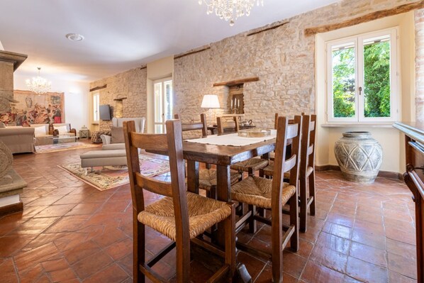 Surrounded by a charming landscape, the villa features a well-maintained garden with breathtaking views over the rolling hills, and offers convenient private parking for 6 cars.
