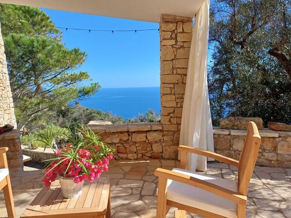 Situated on a natural terrace overlooking the last stretch of the Salento coast, the "Lu Restu" pajara (typical construction) enjoys a wonderful sea view and a small private pine forest that offers coolness on hot summer afternoons. Construction completely covered in stone, recalls the architectural style of the typical "pajare" that characterize the Salento landscape. It fits harmoniously into the surrounding naturalistic context, it is immersed in an uncontaminated Mediterranean scrub among olive trees, pines, mastic trees, myrtles, figs, caper plants and wild fennel ... all in the large private garden (about 3000 square meters). levels bordered by typical dry stone walls. Far from the noise, it is easily reachable along the road that leads from Otranto to Santa Maria di Leuca (from which it is just 2 km away). The property is accessed through the large iron gate, the brick path leads to the large porch, on one side used as a shaded parking area and on the other equipped for outdoor dining and enjoying the suggestive panorama. A little further on, two comfortable chaise lounges, located in the adjacent pitch, allow you to enjoy the sun in complete relaxation. It has a living room with double sofa bed, double bedroom, bathroom with shower, kitchenette, furnished veranda. Among the pluses: air conditioning, mosquito nets, outdoor shower, stone barbecue for delicious grills, private parking space, n. 2 bikes available to guests. Ideal for couples or small families and in general for lovers of relaxing holidays in direct contact with nature. (ideal occupation 2/3 people). Absolutely independent, fenced, it has large private spaces.