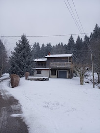 5 km away from the Gerardmer city centre, close to ski runs and the forest for hikes during the summer, this chalet boasts three upstairs bedrooms with double beds and closet wardrobe, a fourth bedroom with double bed on the ground floor, a TV, and a sofa bed. There is also a large living area (60 sq.m) with a fully-equipped kitchen (4-hob induction cooker, fridge, freezer, raclette machine, wine cellar, etc.) that leads into dining room, and a living room with sofas, TV, hi-fi system and DVD player, and WiFi. From the 25 sq.m wooden terrace, which features a barbecue and garden furniture, you can enjoy a view of the mountains in the winter and the daffodils that cover the ground in the spring. The upstairs shower room includes shower and WC and the ground floor bathroom features separate WC. There is a large room available for bicycles and skis and a laundry room equipped with a washing machine and dryer. There are also 4 private parking spaces.