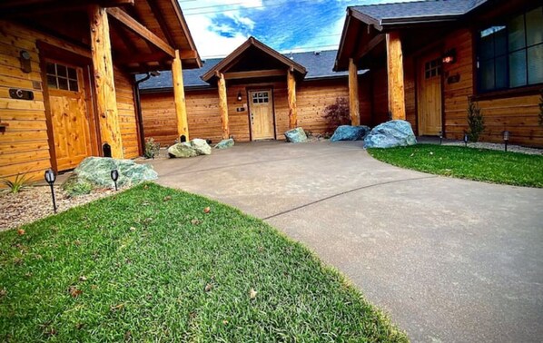 I was SO IMPRESSED with stay in Cedar C! The property is nestled in a cute neighborhood and is fully fenced in. It's very manicured with grass, curving sidewalks and flowers/flowering shrubs. All the cabin front doors face the inner courtyard. Instead was really spacious, squeaky clean and modern with tons of rustic cabin decor. Full kitchen and washer dryer, powerful wall a/c and french doors that open up onto a little sitting area. The TV is gargantuan so take advantage if you can! You can tell a LOT of thought and love went into this place. The shower has a built in seat which is nice for us oldies! Highly recommend and I would stay here again in a heartbeat!