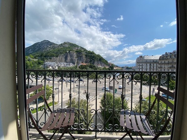 Vous aurez accÚs à un petit balcon cosy avec 2 chaises pliables et superbe vue sur la bastille, les montagnes et le téléphérique.