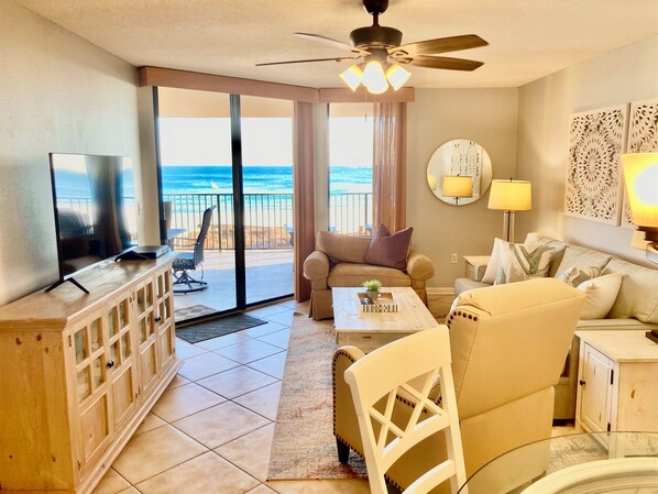 Phoenix 5 Unit #206...This beautifully decorated 2BR/2BA beachfront condo has beautiful views of the beach from a huge balcony! This condo has everything you'll need for a pleasurable and enjoyable vacation including Free Wi-Fi! You'll love the beautiful views from both the living room and master bedroom! Both the master and living rooms have sliding glass door entrances to your gulf front balcony, equipped with a patio table and chairs. And, the living room has a queen sofa sleeper as well if you need it!