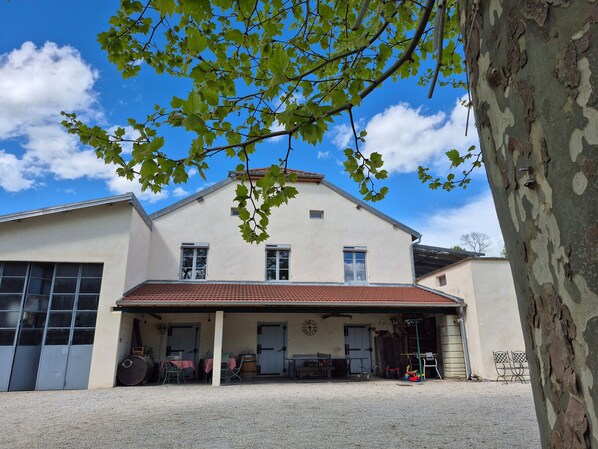 Cette ancienne laiterie bâtie sur des caves d'affinage, laisse à disposition également deux terrasses, une sur l'ancien quai, en contrebas face aux platanes centenaires, et une avec pergola contigue au logement au soleil levant, avec vue sur le parc et l'étang, Parking privatif. Ping-pong, baby-foot et balançoires.