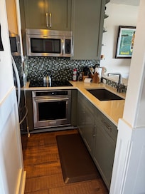 “Kaihalulu” – Unit 105 – is an ocean view studio unit located ground floor in the Mauka (upper) building. There is a queen-size bed, a spacious covered lanai with a small dining table and comfy chairs and a great view. The unit has ceramic and laminate floors, wood sliding doors, a modern kitchen with a cooktop and convection microwave oven, a tub/shower combination with custom tile and a very nice view.