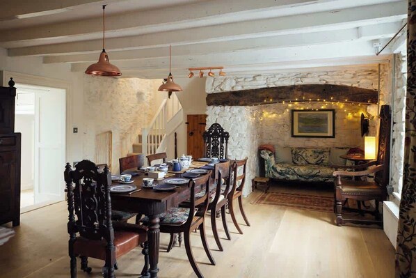 Coming through the front door, you step directly into the spacious dining room with an impressive inglenook fireplace, the heart of the home. From here, a door leads into the galley kitchen, complete with a range cooker and patio doors to the outside. Another door from the dining room takes you to the utility room, boot room, and downstairs WC, providing practical spaces for guests. There is also one of two of the property's stairwells located off this room.