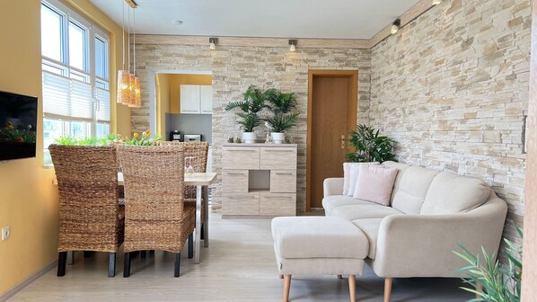 À seulement 80 mètres de la plage, l'appartement situé à l'étage et offrant une vue sur la mer est baigné de lumière. Même un petit balcon vous invite à prendre le petit-déjeuner ou un verre de vin le soir. De nombreuses fenêtres avec des plis à revêtement spécial assurent un climat intérieur individuel. Une chambre spacieuse et une seconde chambre séparée servent les familles avec beaucoup d'espace. Deux grands lits extra-hauts (160cm et 140cm) et un salon séparé avec un canapé de couleur assortie ne laissent rien à désirer. Une cuisine moderne entièrement équipée, une télévision LED SMART, une chaîne hi-fi et un accès Internet nous permettent d’oublier tous les soucis. Votre appartement est aussi allergique que non fumeur. Des draps en coton blanc et résistant et des serviettes douces vous plairont. Des torchons et un tapis de douche sont disponibles. Intéressant pour les jeunes familles, les structures d’hébergement ont été apportées (soit dans la maison de votre appartement au rez-de-chaussée, soit dans l’abri à vélos). À la ferme, vous trouverez une grille de séchage pour votre linge humide. Votre véhicule dispose d'une place de stationnement réservée directement à la maison de vacances. Pour toute chaise haute ou lit de voyage, aucun frais supplémentaire ne vous sera facturé. S'il vous plaît nous informer de vos souhaits dans les meilleurs délais.