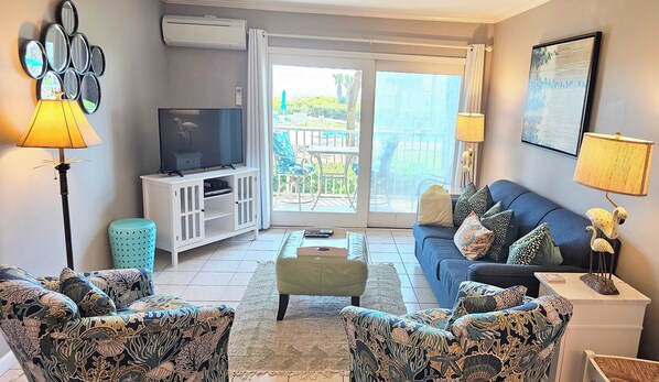 This is a wonderfully appointed 2 Bedroom, 2 Bath condo that has Ocean Front Views, Pool and 4 Adult Beach Cruiser Bikes! It has a full kitchen, dining table, wonderful family room and a great patio and is CLEAN and Updated! It is very well decorated, fully furnished, a King Bed in the Master with brand new mattress and has it's own private bathroom, a desk and dresser and 2 night stands with 2 lamps! The large 2nd bedroom offers a twin bunk bed and a single twin with a dresser and lots of closet space! The kitchen is large and all appliances are full size, it even has an ice maker. The table seats 6 and is open to the kitchen and living room. The entire condo has been remodeled and has tile floors throughout. You have the luxury of a split heating and air system in each room, ceiling fans throughout and a wonderful balcony to enjoy the views! There are 4 newer beach chairs and a beach cart for trips to the beach! This unit is very well cared for, very clean and is very quiet. It is on the first floor with no stairs. Parking is very close by, free and safe as this is in a gated complex! The condo is perfectly located near Coligny Plaza, just minutes from everything!