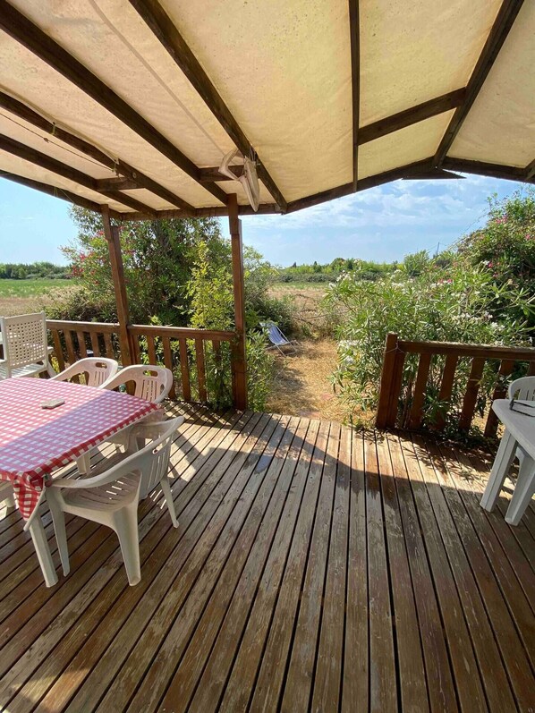 Le mobile home a une terrasse et un jardin immense au calme absolu.