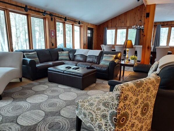 We loved that there were so many sitting areas - chairs around the island, dining room table & chairs, couches -in open concept living space - outside table/chairs and couch on deck ( we saw a bear from there - going up Graustein Rd!). Awesome playroom for kids in the basement, hot tub outside and more seating. Great fire pit & very clear recycling instructions!