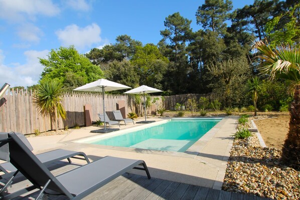 Terrasse avec transats et mobilier pour les repas en plein air, au cœur d'un jardin arboré, piscine chauffée 9x4x1.5m avec une plage de 2x2m.