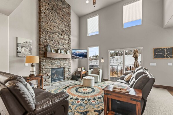 As you enter the main level, you'll be welcomed by a spacious and elegantly appointed LIVING ROOM. Here, leather couches invite you to sink in and unwind around a beautiful gas fireplace, creating a warm and inviting atmosphere. Whether you're catching up on your favorite shows on the 55” Smart TV with a soundbar or enjoying a family movie night with the DVD/CD/Blu-Ray combo, this space is designed for relaxation and connection. The ceiling fan ensures comfort no matter the season, making it the perfect spot for gathering with loved ones. Need an additional sleeping option? The provided raised and self-inflatable Queen air bed is perfect for the living area in front of the fireplace for evening TV and a restful night’s sleep.
