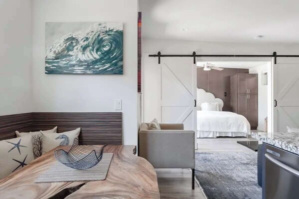The villa features air conditioning, high-speed Wi-Fi, a fully equipped kitchen with quartz countertops, a comfortable king bed, and a full bathroom with a walk-in shower. Thoughtful touches throughout the space ensure a relaxed and convenient stay. Thoughtfully designed like a second home, Villa 3 comes stocked with essentials and travel extras: beach towels, iron and ironing board, tupperware, wine glasses, dishwasher pods, clothes drying rack, and more. Basic necessities—linens, bath towels, kitchen rags, travel-size toiletries, and pantry staples like salt, pepper, and olive oil—are also included.