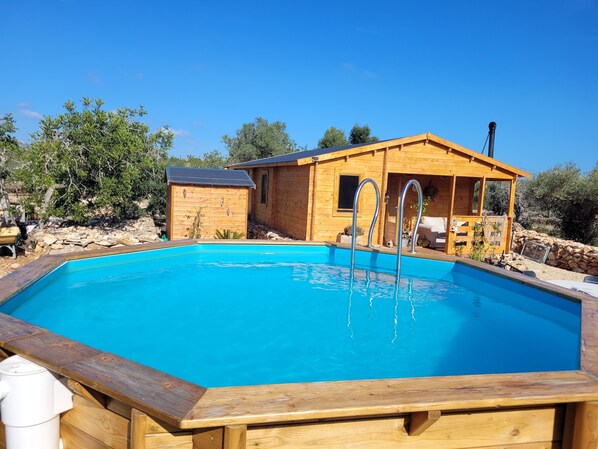 Chalet romantique avec piscine privée au milieu des oliviers.
