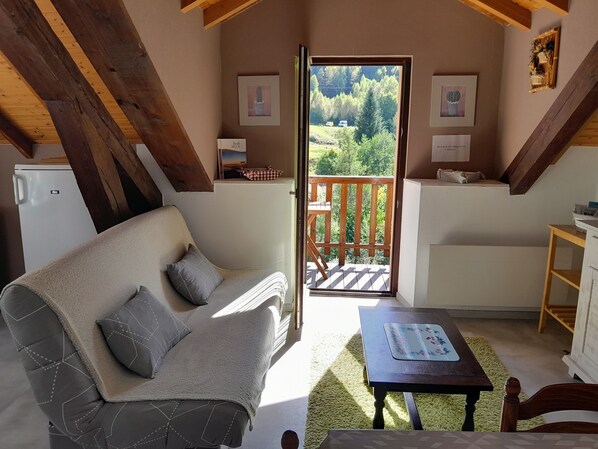 - A fitted kitchen area, with dishwasher (new), ceramic hob and electric oven, microwave oven, coffee makers, toaster, fridge (new) with freezer compartment, fondue, raclette / pierrade appliances, the all adjoining a living room with 1 convertible sofa of 140, a TV (new), DVD player, a table for 6 people; all overlooking a balcony with mountain views.