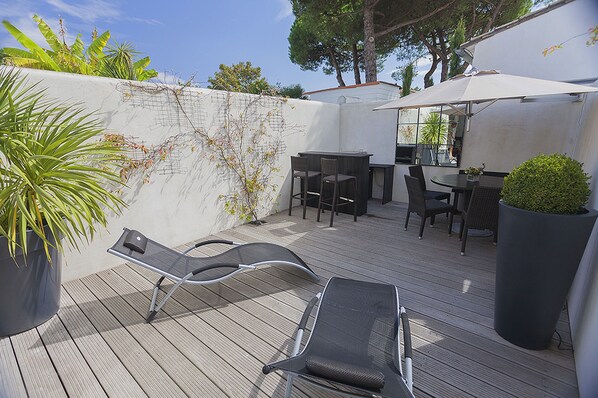 Pour réussir ses vacances et se reposer, prestation de qualité, fonctionnelle, décoration soignée, cour privative fermée, fleurie et ensoleillée sans vis à vis.
