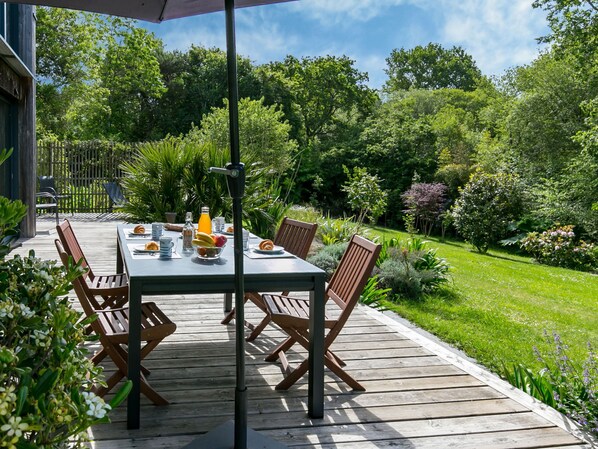 "Ty Coat", maison 4 pièces 150 m2 sur 2 niveaux. Clair, aménagement de bon goût et plaisant: grand séjour/salle à manger avec baie vitrée avec table pour les repas, TV et chaînes de TV internationales. Sortie sur la terrasse. 1 chambre avec 1 grand-lit (160 cm, longueur 200 cm). Sortie sur la terrasse. Cuisine ouverte (four, lave-vaisselle, 3 plaques vitrocéramiques, grille-pain, bouilloire électrique, micro-ondes, congélateur, cafetière électrique) avec petite table pour les repas. Douche/WC. À l'étage supérieur: salon ouvert. 1 chambre avec 1 grand-lit (160 cm, longueur 200 cm). 1 chambre avec 2 lits (90 cm, longueur 190 cm). Douche, WC séparé. Chauffage électrique. Sol en parquet. Grande terrasse 38 m2, situation sud, petite terrasse 5 m2, situation est. Meubles de terrasse, barbecue, chaises longues (4). Belle vue sur le jardin et le bosquet. A disposition: lave-linge, fer à repasser, chaise haute pour enfant, lit bébé, sèche-cheveux. Internet (Connexion WIFI, gratuit). Veuillez noter: maison non-fumeur. Détecteur de fumée. Maison écologique, basse consommation.
