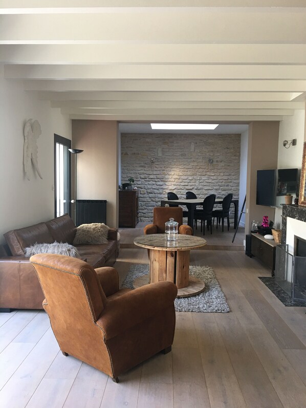 Grand Séjour/Salle à manger, avec canapé et fauteuils, cheminée, TV écran plat, enceinte bluetooth de qualité, WIFI, grande table avec 6 chaises.