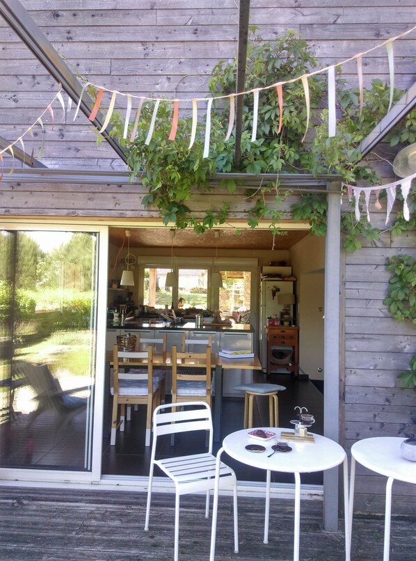 La maison est parfaitement équipée et dispose de tout le confort. Au RDC, une vaste cuisine équipée (25m²) ouvre sur la salle à manger et le salon (40m²) avec bibliothèque, 2 terrasses dont une couverte pour les moments les plus chauds de la journée vous accueillent avec plancha et barbecue. A l'étage, 3 grandes chambres au calme ouvrent sur le jardin, la mare et un accès en terrasse pour la suite parentale (chambre grise, avec salle d'eau et dressing). Les 2 autres chambres se partagent une agréable salle de bain avec baignoire. Pour tous, nous avons une pièce (30m²) détente et jeux, où l'on peut aussi avoir des couchages pour enfants (1 canapé lit et 1 lit en 90cm) .