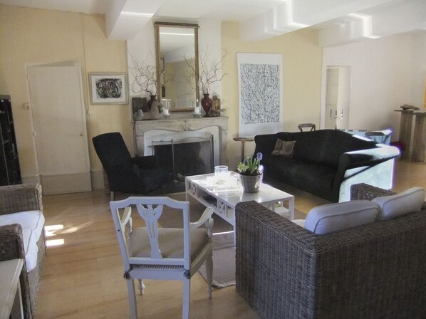 To the right of the entrance is the large kitchen (6 x 8 meters) with a cooking area with fridge, oven and dishwasher, a sitting area and a huge dining table for 12 people. To the left of the entrance is the salon with a fireplace and a separate TV corner, where you can see French and Dutch channels or one of the films from the extensive DVD collection.