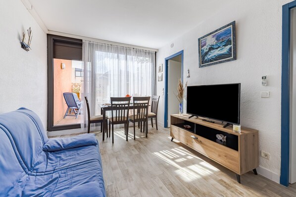 - Une pièce de vie de 15 m² avec TV connectée, canapé et un coin repas pouvant accueillir 4 convives.