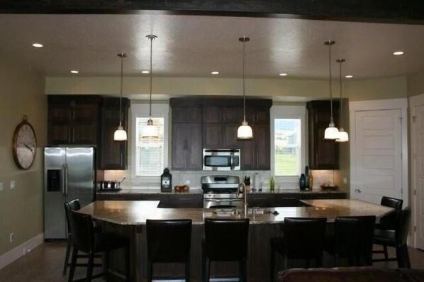 Une grande cuisine familiale est entièrement approvisionnée et il y a deux réfrigérateurs pleine grandeur pour accueillir les grands groupes et les réunions de famille.