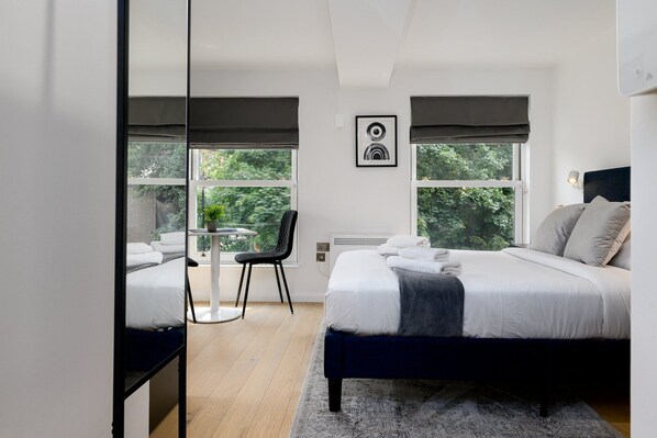Each studio is bright, fully furnished, and completely self-contained. It features a comfortable bed, a modern en-suite bathroom, and a private kitchenette equipped with a fridge, hob, microwave, dishwasher, and essential cookware — everything you need to feel at home. High-speed Wi-Fi is included, which is ideal for remote work, study, or streaming. There is also a shared washer/dryer on the ground floor.