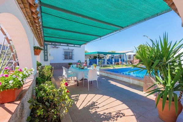 Votre espace extérieur privé comprend une piscine, un jardin, une terrasse plein air, une terrasse couverte et un barbecue.