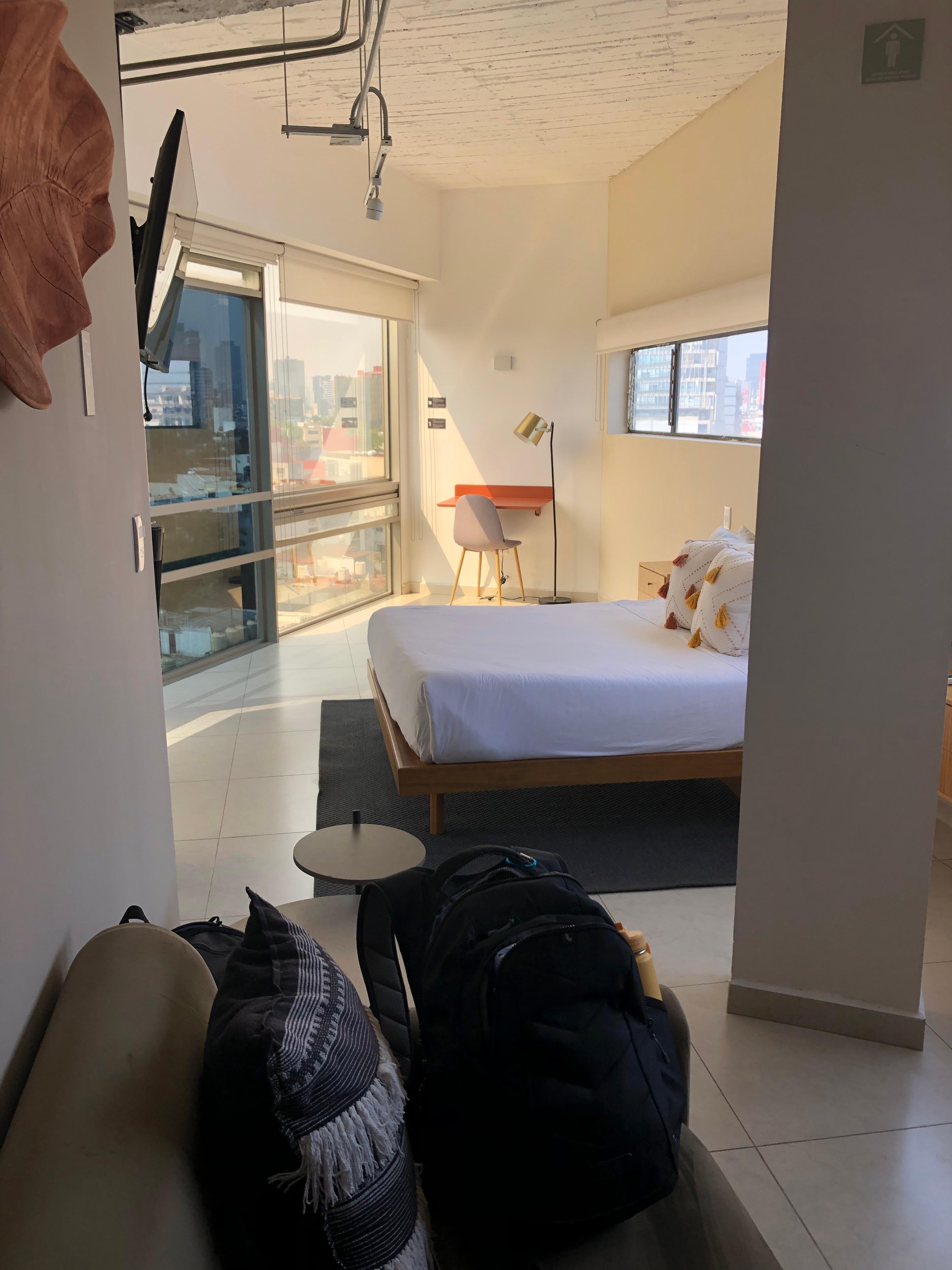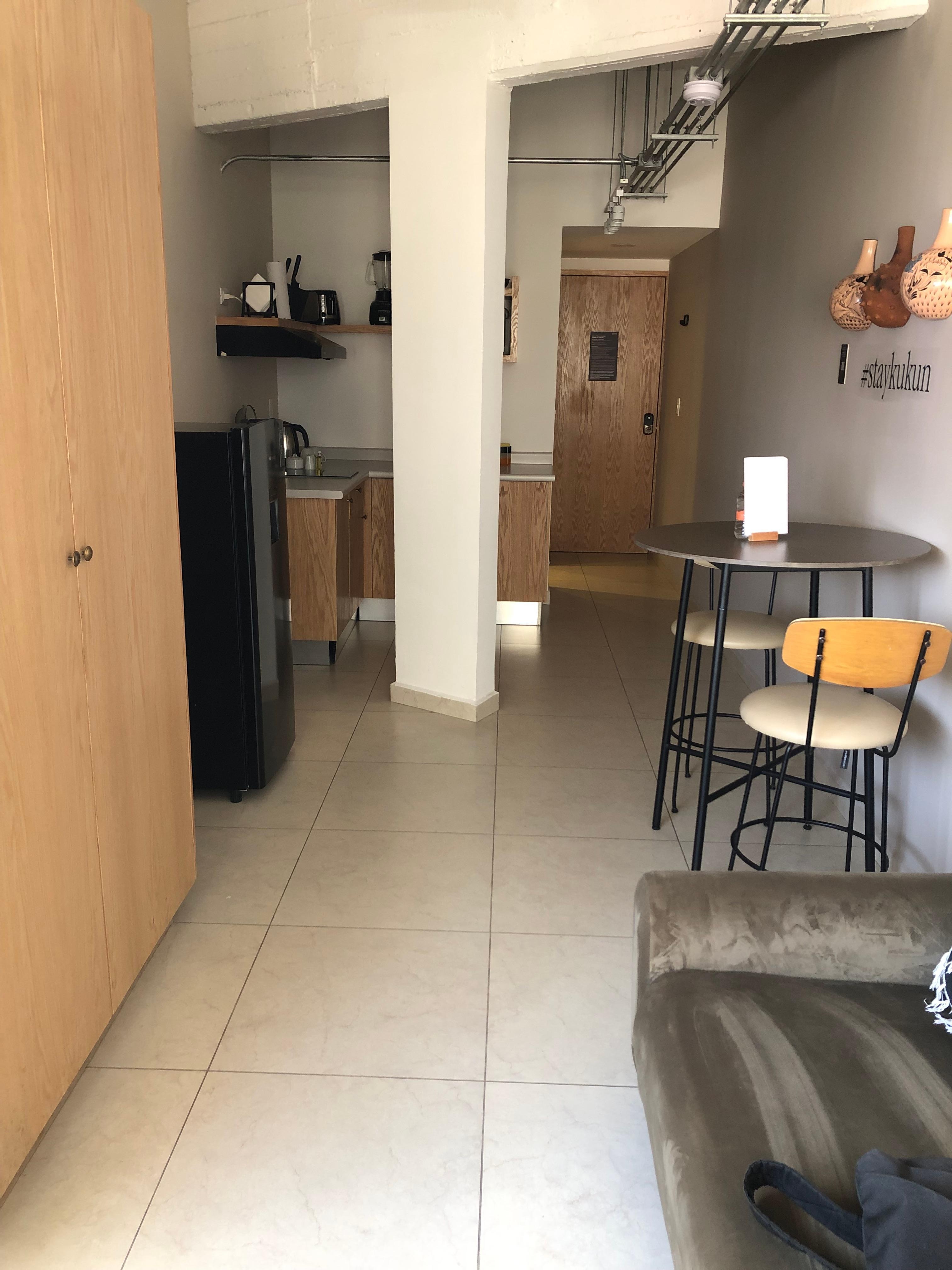Está en un buen lugar, hay un súper cerca y muchos lugares donde comer o tomar un café. La habitación deja algo que desear. Para empezar, deberían aclarar que el aire acondicionado es un aire portátil, que si bien logra enfriar algo no hace el mismo trabajo que un equipo fijo. Además, esto hace que la ventana que está en la habitación donde está la cocina no se pueda cerrar, lo que hace que el ruido y el aroma de los puestos callejeros de comida que están en la esquina entren desde temprano (el sonido es tolerable ya que incluso incluyen tapones para oídos pero el aroma a aceite y garnachas nada lo tapa). La habitación en general está OK, aunque necesita mantenimiento. Además, algunas cosas no tienen sentido: del lado de la cama donde está el buró no hay interruptor para encender y apagar las luces de la cabecera; la zona donde está el escritorio no tiene conexión para conectar una laptop o algún otro equipo; la televisión está conectada con un cable parchado que va al aire acondicionado portátil que deja mucho que desear; la habitación tiene un armario improvisado para colgar ropa que está encima del buró de la cama, a menos que seas una persona muy alta es imposible usarlo; el baño tenía la manija suelta, no se podía cerrar la puerta; y los muebles que están en la cocina a manera de desayunador son la cosa más incómoda del mundo, no se a quien se le ocurrió que una mesa alta con periqueras era ideal para una habitación. Honestamente, no dan ganas de regresar.