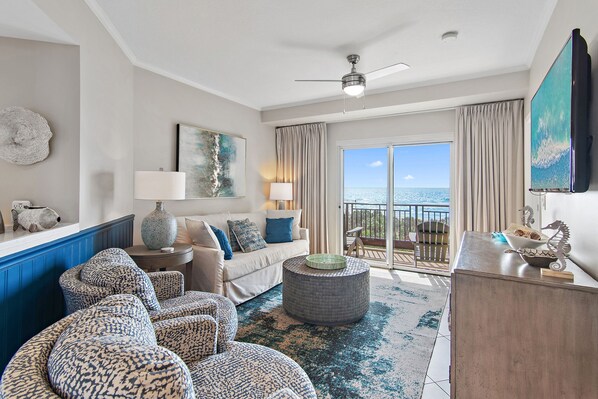 Le décor gris clair et crème doux que l'on retrouve dans l'ensemble est parfaitement assorti au sable blanc et aux magnifiques eaux émeraudes du golfe juste à l'extérieur de la fenêtre. Avec une cuisine moderne et mise à jour qui se prolonge dans une salle à manger et un salon spacieux comprenant un centre multimédia entièrement équipé avec une télévision SMART de 55 pouces, cet élégant condo ne manque pas de commodités, ce qui en fait un endroit idéal pour famille élargie pour une mini retraite.