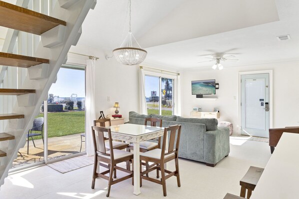 First Floor: Living Room with Queen Sleeper Sofa and Patio Access, Kitchen, Dining, Twin Bunk Nook, Hall Bath with Tub/Shower Combo.