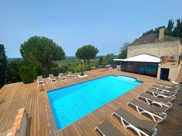 Première terrasse (300 m²) : une piscine chauffée au sel (10 m x 6 m) entourée de transats pour vos moments de détente.
