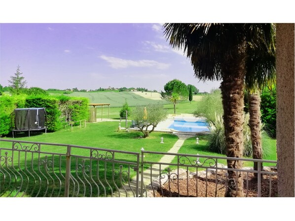 Equipement extérieur : salon de jardin, barbecue, paillote, une table de ping pong, un terrain de pétanque, une piscine dimension 5/10m et profondeur progressive jusqu'à 1m80 avec volet roulant pour la sécurité des enfants (réservée exclusivement aux locataires), un très grand jardin privatif.