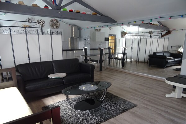 Le logement est 1 pièce à vivre de 51 m2, joliment décoré sur le thème de la Musique. Salon canapé cuir et banquette lit 1 pers. Espace cuisine équipée. Espace nuit avec lit à baldaquin, séparé par de jolis paravents modulables. Salle de bains douche et wc. Terrasse coin repas, couverte.
