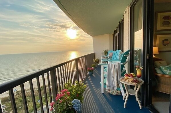 View of the beach, many amenities (pools, hot tubs, shuffleboard, grills). Central location, spacious, and clean! Will come again!