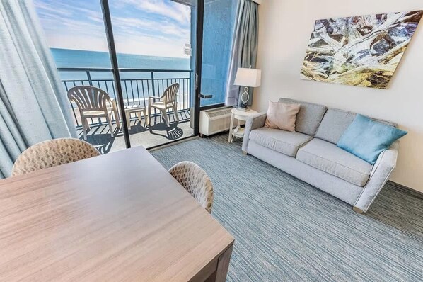 Nice place, but not great if you want on-site convenience for food or sundries. You're not renting thru the on-site rental, so you can't use the on-site restaurant, pool-side bar, store, or Starbucks. And yes, this was mentioned in the description. We planned to cook most of our meals, but that was difficult. There's not much counter space, they only have a Keurig, not a drip coffee machine, the plates and drinkware is all plastic, some of the utensils are broken. The check-in process is ridiculous. we had to jump thru so many hoops just to get to our room. It took many back and forth texts with the management company. You need to read the multitude of emails CAREFULLY as there is a lot of info in there. This is probably the worst check-in experience I've ever had.The unit itself if nice, very clean, the beds are comfortable as is the rest of the furniture. The view is definitely ocean front. The A/C worked great. The parking is free and convenient and you don't need a mirror hanger or sticker. The pools are nice and plentiful. The elevators are never crowded and quickly available. The unit was quiet even when the DJ was playing by the pool bar. The mattress was comfortable.If you're going to eat out the whole time and don't want to eat on site or have drinks by the pool, then you'll probably give the place 5 stars.