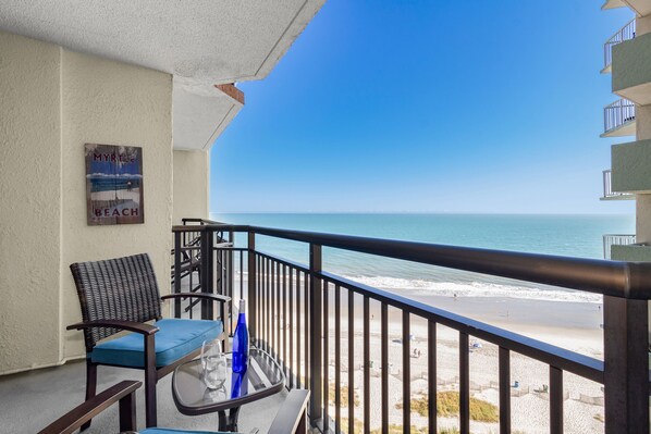 On the beach, near restaurants, balcony
