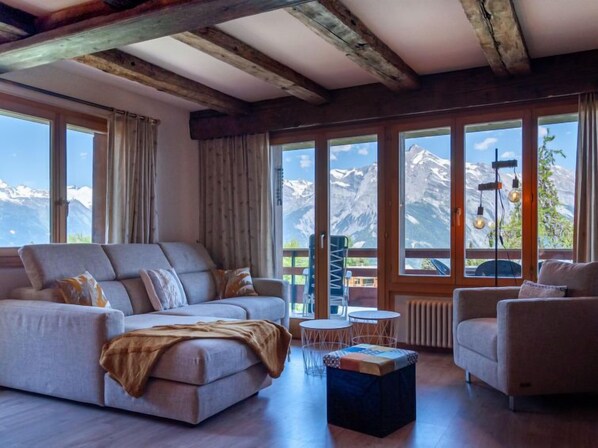 "Quille du Diable 44", apt 3 pièces 80 m2 au 3ème étage, situation nord-ouest. Spacieux, partiellement rénové en 2023: grand séjour/salle à manger avec cheminée (uniquement à titre de décoration), TV (câblée). Sortie sur le balcon, orientée nord et orientée ouest. 1 chambre avec 1 grand-lit (160 cm, longueur 200 cm). Sortie sur le balcon, orientée sud. 1 chambre avec 2 lits (90 cm, longueur 190 cm). Sortie sur le balcon, orientée sud. Cuisine (3 plaques de cuisson, four, lave-vaisselle, grille-pain, cafetière électrique, Capsules pour machine à café (Nespresso) (NON INCLUSES), appareil à raclette, service à fondue (fondue chinoise, fondue au fromage)). Sortie sur le balcon. Bain/WC, douche/WC. Meubles de terrasse, barbecue (portable). Très belle vue panoramique sur les montagnes. A disposition: sèche-cheveux. Internet (Connexion WIFI, gratuit). Veuillez noter: logement non-fumeur. Maximum 1 animal/ chien autorisé.