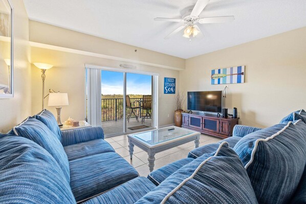 Decorated with Florida style, this beautiful 3 bedroom 2 bath condo offers a view of the coastal wetlands. This condo is very spacious and features tile throughout with carpet in the bedrooms. The living room features a wrap-around couch, flat-screen TV, and sliders to the private patio. There is a fully equipped kitchen with granite countertops and a dining room with seating for 6.