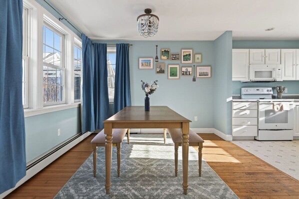 Toutes les chambres de l'hébergement Gorgeous Downtown Townhome - Walk to Beach disposent de touches de confort comme un système de réglage de la climatisation et un coin salle à manger séparé, ainsi que de services et équipements comme une chaise de bureau et une table à manger.