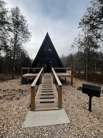 Your cozy getaway awaits in this luxurious A-frame cabin. Nestled on Cricket Creek, this cabin features a custom hand-crafted sauna, hot tub, fire pit, & fireplace. This cabin features color changing accent lights, a spacious master bedroom with king bed and an elevated loft with two twin beds. Cozy up in the private hot tub or enjoy a cup of coffee or your favorite beverage on the back deck as you listen to the serenity of the creek nearby. Experience blazing-fast Wi-Fi and a fully equipped kitchen, perfect for enjoying a home-cooked meal while streaming your favorite shows. Featuring an outdoor firepit, a charcoal grill, and a scenic walking path along the waterfront, where you can swim, fish, kayak and enjoy all of Tablerock lake adventures. This is the perfect spot to unwind, relax, and reconnect in the beauty of nature.