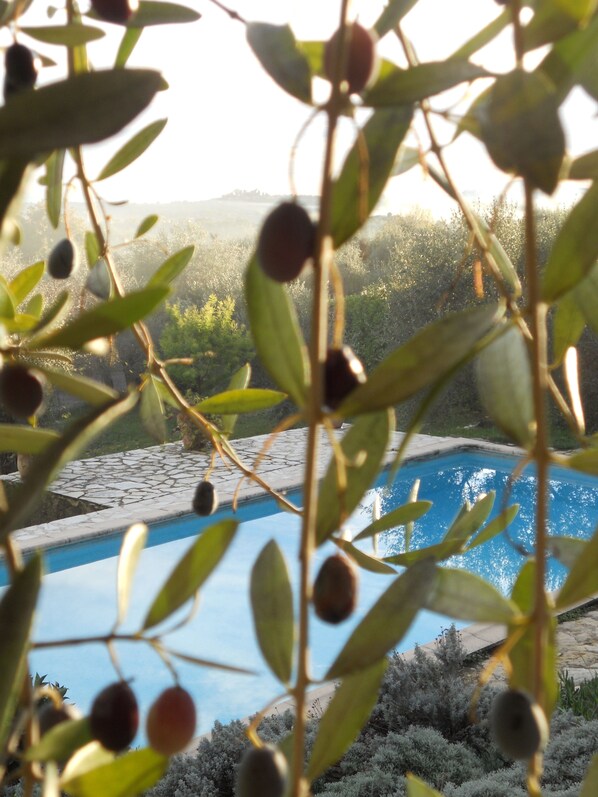 La véranda tout le long du côde se retirerté sud de la maison est en grande partie couverte, avec une large vue panoramique sur la mer Méditerranée, les oliviers, les agrumes, les figuiers dans le jardin, et sur la piscine. Une autre terrasse se trouve dans le jardin. Vous pouvez vous reposer dans un hamac à l'ombre du marronnier. La nuit, vous voyez les lumières des villes côtières comme Antibes avec son phare. Par temps clair, la Corse se dessine à l'horizon au petit matin.