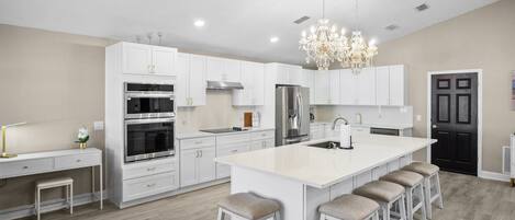 House - It was newly updated and very nicely decorated. We loved that two bedrooms had their own bathrooms. So my teen daughter moved right in and loved having her own space and not sharing a bathroom. She loved the decor too. The house had pretty much everything you need. My teenage son loved the game room and that he could have a bigger bottom bunk instead of a twin bed. The kitchen had pretty much everything we needed. Lots of pans, pots, tupperware etc.