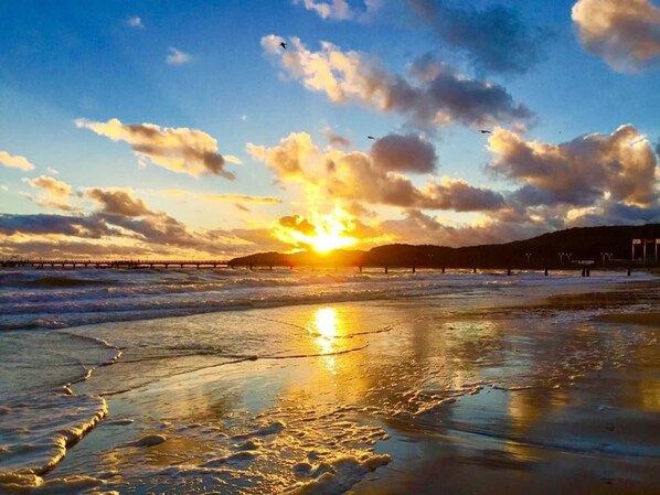 This luxury penthouse apartment for 4 people with great sea views spoils you with two balcony terraces, fireplace, your own sauna in the apartment and a magnificent sea view. The exclusive facility is equipped with an elevator, an underground car park, a bicycle parking space, a sauna (for a fee), and a laundry room with dryer and washing machine (for a fee). Look forward to relaxing days on the Baltic Sea and enjoy the fresh sea air!The villa ensemble in Baabe opened in July 2019 and is located in close proximity to the beach and the sea. It is divided into the two houses dune and sandpiper. The location by the sea gives you a great sea view from many of the exclusive apartments. There are a total of around 40 high-quality modern residential units, all with a balcony or terrace, floor-to-ceiling windows and underfloor heating. A communal sauna with relaxation room is available in the basement. There is also a washer and dryer for a fee.